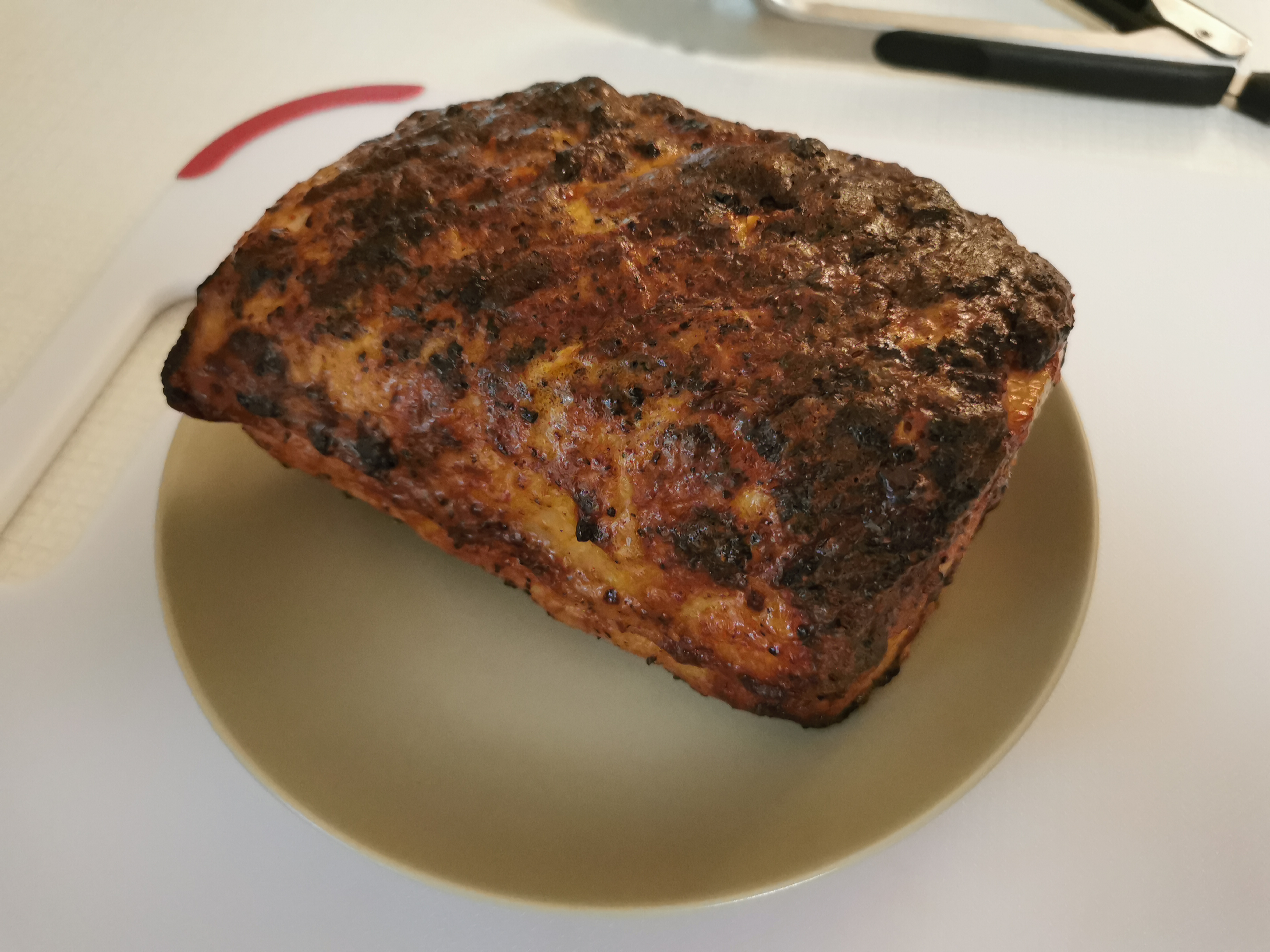 - When the pan is hot, add some cooking oil and sear the pork on all sides. Once the outside had been nicely browned, place it in the center of the frying pan, fat side up and base with the mayo mixture. Place the roast and frying pan in the oven and cook at 400 C for 30 min, increase the temp to 425 for 15 min and check for doneness. Internal temp should be 140.